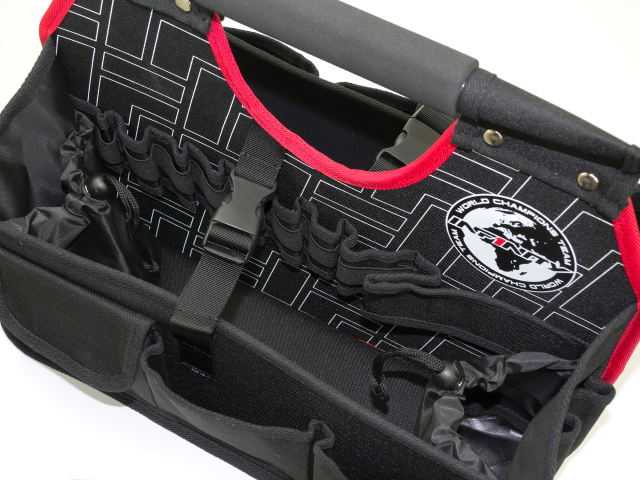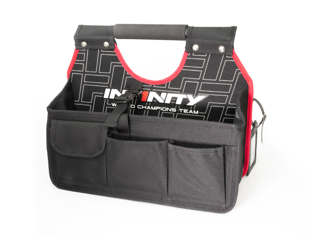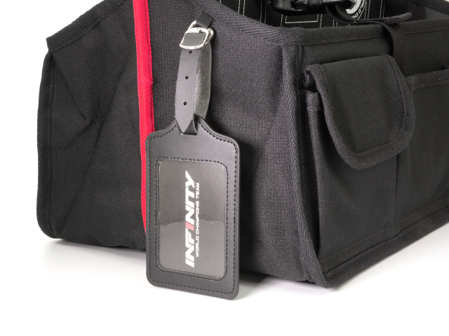 ブラックボディにレッドステッチのINFINITYチームカラーをあしらったピットバッグ。ツール用の複数のスロットと、スターターボックス、ポケットブースター、フューエルガンや燃料ポンプなどの必需品や、スペアパーツなどを収納するスペースがあります。 サイズ:40x26x34cm。