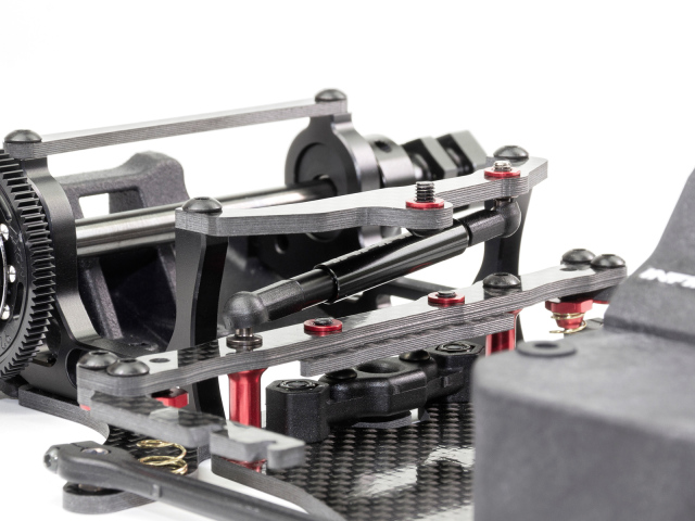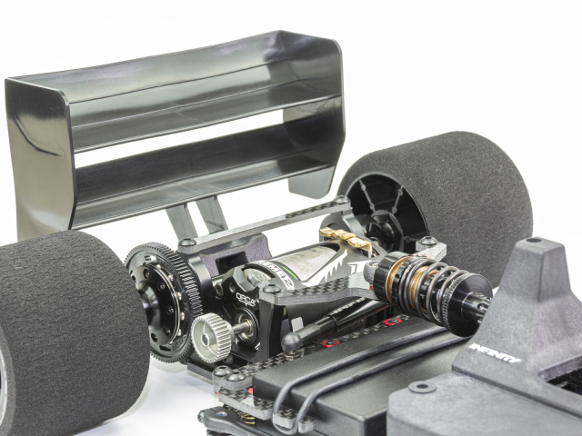 INFINITY製キットとして史上初となる、3Dプリンティングによるナイロン樹脂成形パーツで再現されたリアデュフューザー一体型リアウイングマウントは、スケール感と走りを高次元で両立させるというIF11のコンセプトからなり、IF11-2を象徴するパーツの一つ。 ほとんどのカーボンプレートパーツ及びリアバルクヘッドをリデザイン。 安定したリアグリップとトラクション。十分なステアリングレスポンスと高いコーナリングスピード。 これらを高次元でバランスさせることに注力し開発されたIF11-2の走りを、ぜひキミの手で感じてほしい。 ※フロントホイールはホイール内径40mm以上の大径タイプに適応。別売りパーツで小径ホイール(内径36mm)にも対応可。
