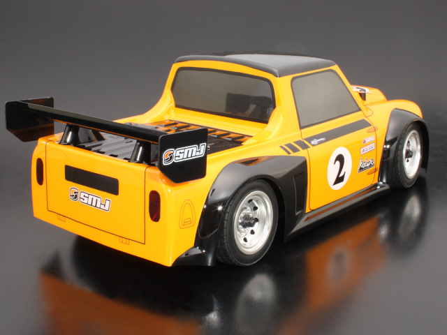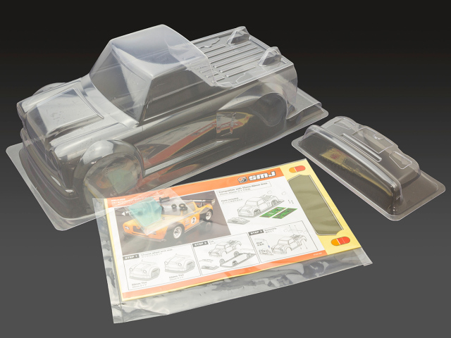 Mシャーシ(ホイールベース210mm)用SMJオリジナルボディ。 前後オーバフェンダーと大きなリアウイングが目を引くレーシングピックアップスタイル。 専用デカール付き。