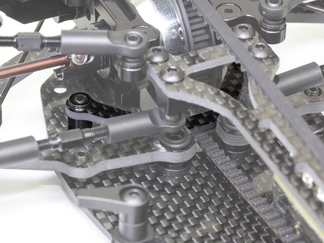IF14スペチアーレ用 シャーシブレース。フレックス調整を自在に フロントおよびリアバルクヘッド付近のシャーシフレックス特性を最適化できる専用ブレース。ネジ2本で簡単に着脱可能、走行状況に応じたセットアップ変更もスピーディに行えます。 素材には2mm厚の高品質カーボングラファイトを採用し、剛性としなやかさを両立。